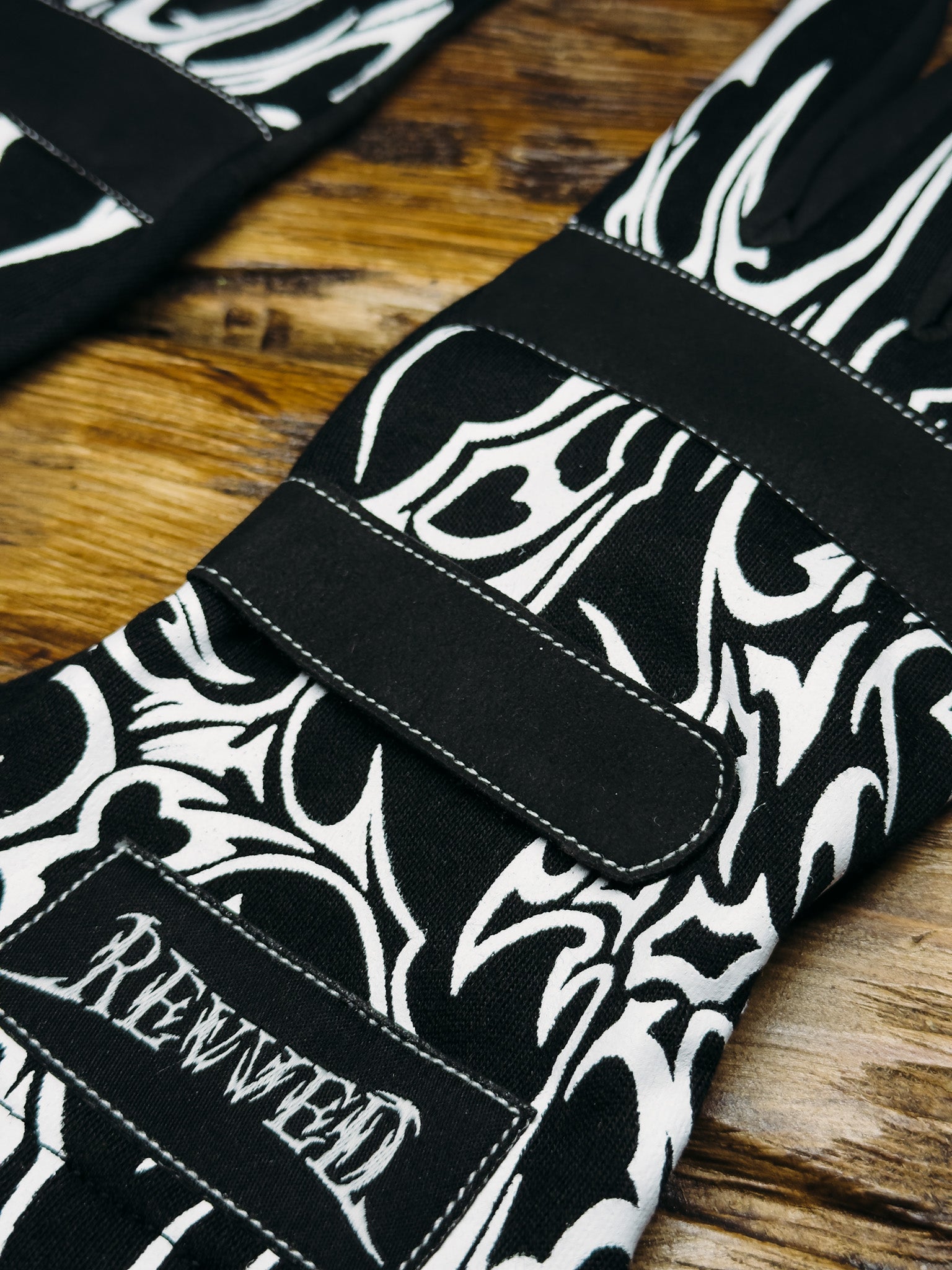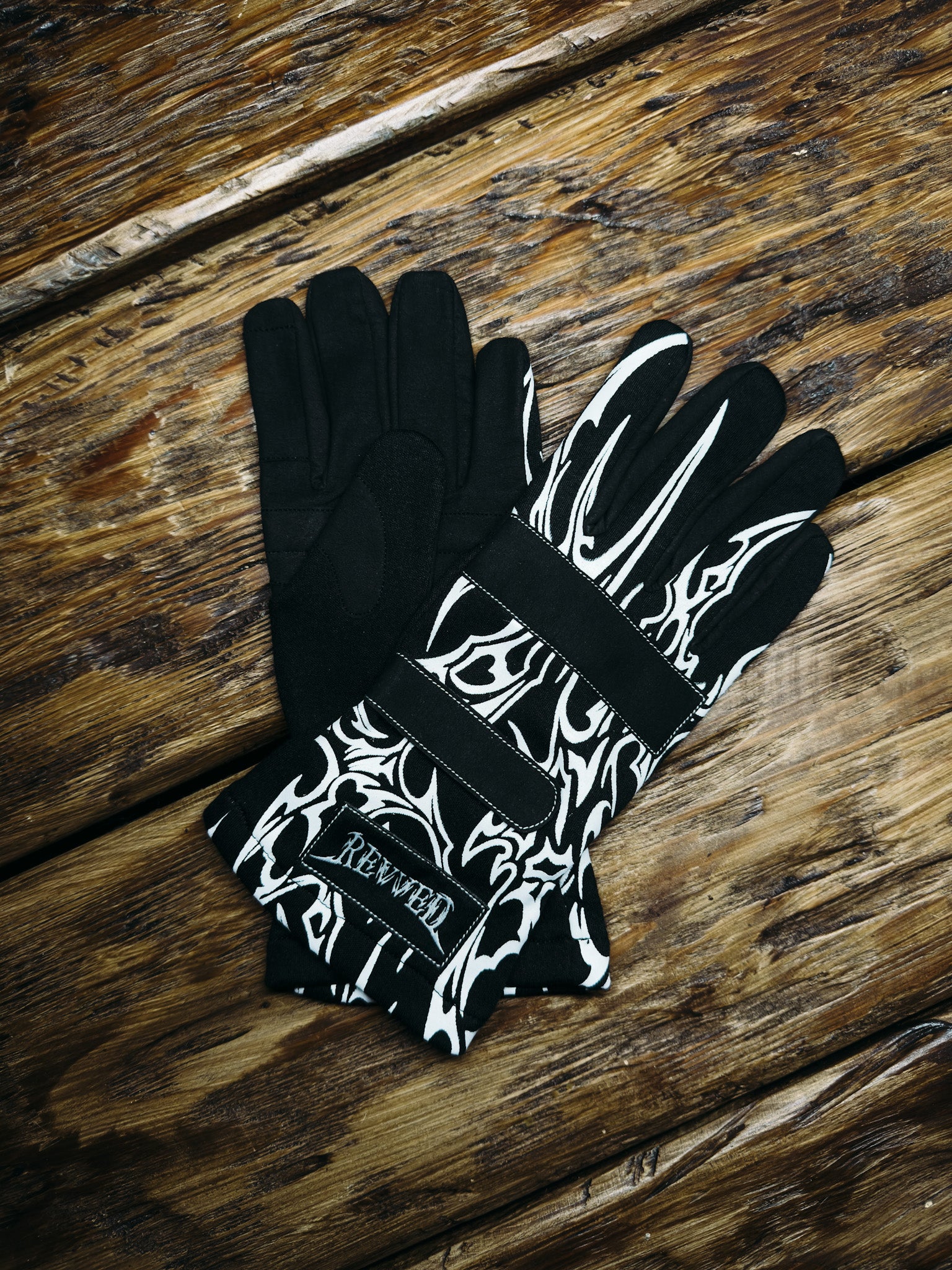 The gloves feature a clean black upper section with a bold tribal-inspired white design, black palm side for improved grip. Details include a black knuckle panel, black fastening strap, and a black patch with a white REVVED logo. Finished with white stitching for a sharp look.